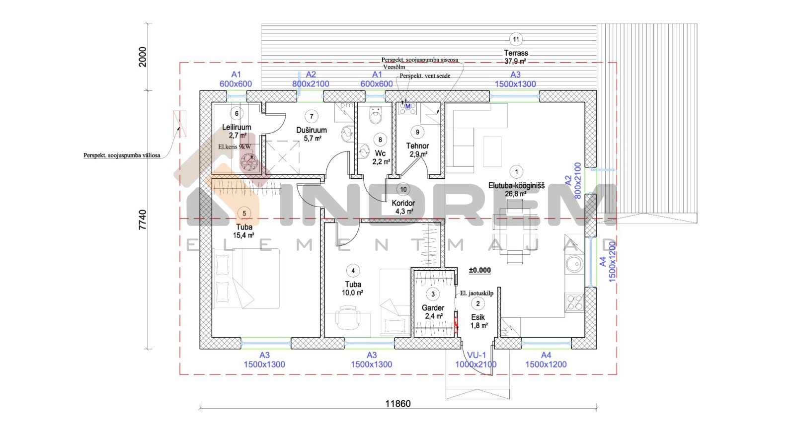 Elektritööd: Majale koostame elektriprojekti mille alusel kogu süsteemi valmis ehitame, ning tööde lõpus tellime elektripaigaldise kasutuselevõtu eelneva auditi. Maja valgustid ei sisaldu hinnas. Pistikuid on jagatud maja peale normaalses koguses ja lisaks on varustatud pistikuid väljaspool maja. Tehtud on ka ettevalmistus valveseadmete ja suitsuandurite kaablitele, ning võimalus ehitada lokaalne süsteem kui ka turvasüsteemiga ühendada.